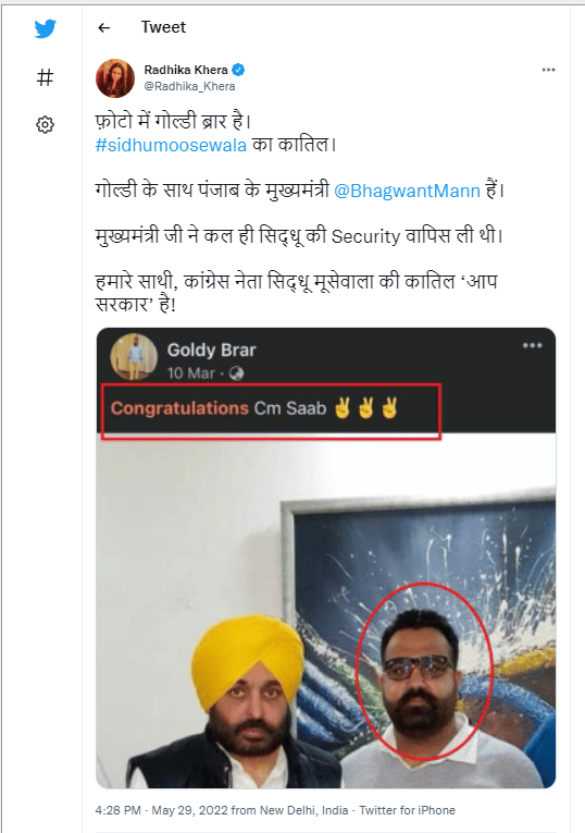 In a now-deleted Twitter post, Congress National Media Coordinator Radhika Khera, had also shared the image and held the AAP-led government in Punjab responsible for Moosewala’s death.