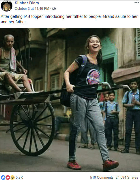 Basha’s tweet claimed the girl pulling the rickshaw was an IAS topper who was introducing her rickshaw-puller father to the world. Basha attributed the image to a person named Sanjay Singh. The tweet was liked by more than 2,700 users and retweeted by more than 800 accounts.