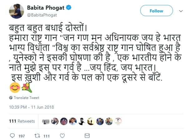 New Delhi: Commonwealth gold medalist and wrestler Babita Phogat Monday tweeted that UNESCO has declared Indian national anthem as the best in the world.