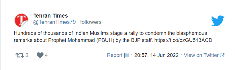 Tehran Times, an English language daily, initially shared the video with the caption: “Hundred of thousands of Indian Muslims stage a rally to condemn the blasphemous remarks about Prophet Muhammad (PBUH) by the BJP staff” and soon deleted it.