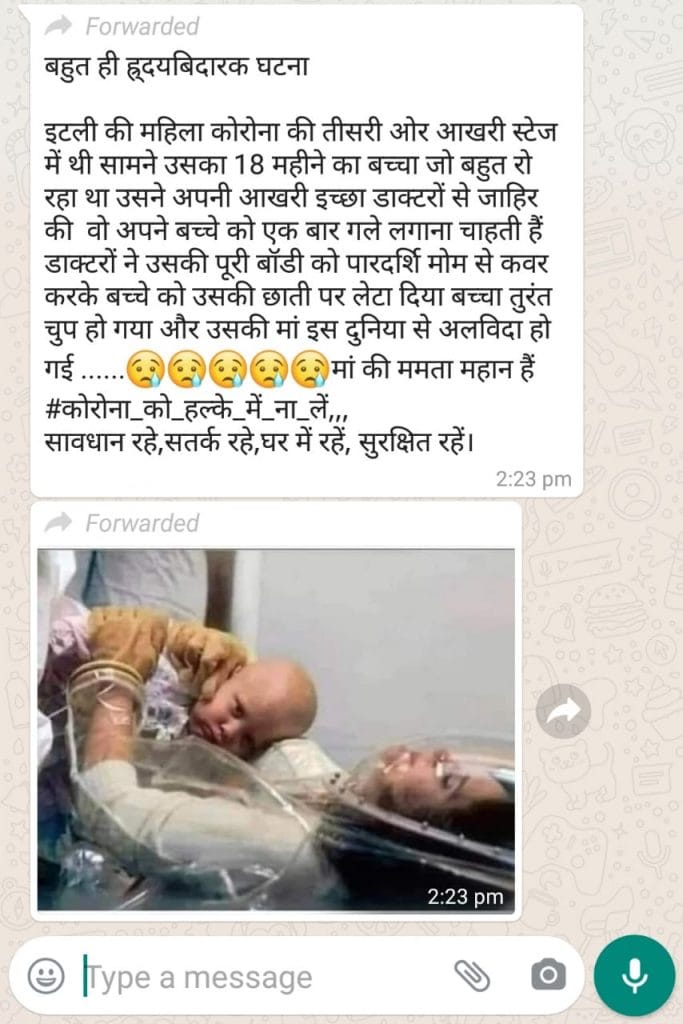 The image of the woman and the baby is being circulated on WhatsApp as well, with the same caption. Many of these forwards are accompanied by warning messages asking people not to take Covid-19 lightly and encouraging them to maintain social distancing norms by staying at home during the nationwide lockdown.