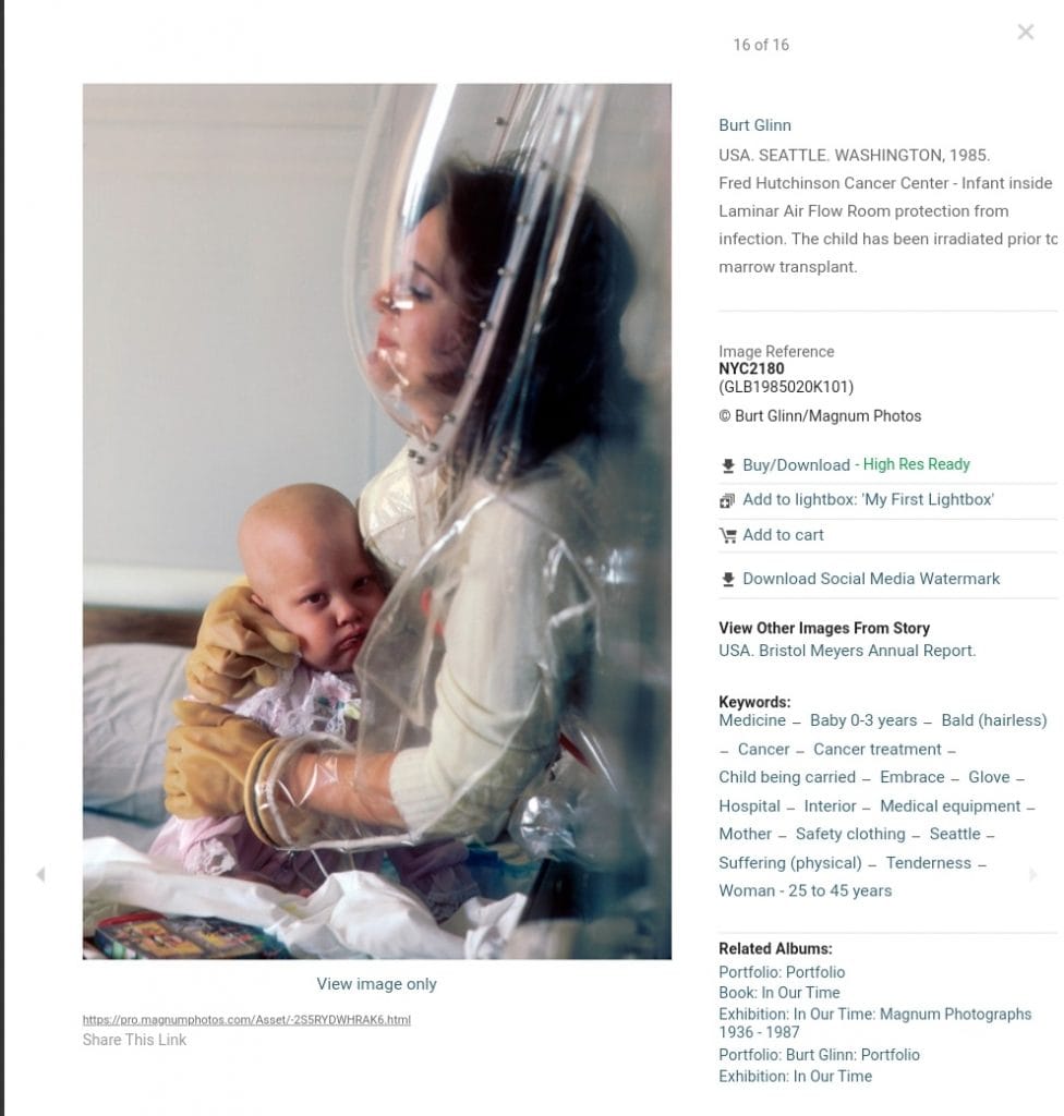 The original image was taken by American photographer Burt Glinn at the Fred Hutchinson Cancer Center, in Seattle, US. The baby photographed was irradiated before a bone marrow transplant and the mother held the infant inside a laminar airflow room.