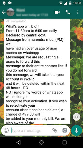 The fake message also stated that WhatsApp “is going to cost you money soon”. “The only way that it will stay free is if you are a frequent user i.e. you have at least 50 people you are chatting with,” it said.