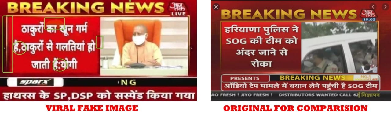 New Delhi: A screenshot of a news bulletin, claiming to be of Hindi channel Aaj Tak, is being widely shared on social media. It quotes Uttar Pradesh Chief Minister Yogi Adityanath as saying “Thakuron ka khoon garam hai, thakuron se galtiyan ho jati hai” (Thakurs are hot blooded, they tend to make mistakes) in connection with the alleged gang-rape and assault of a 20-year-old woman in Hathras.