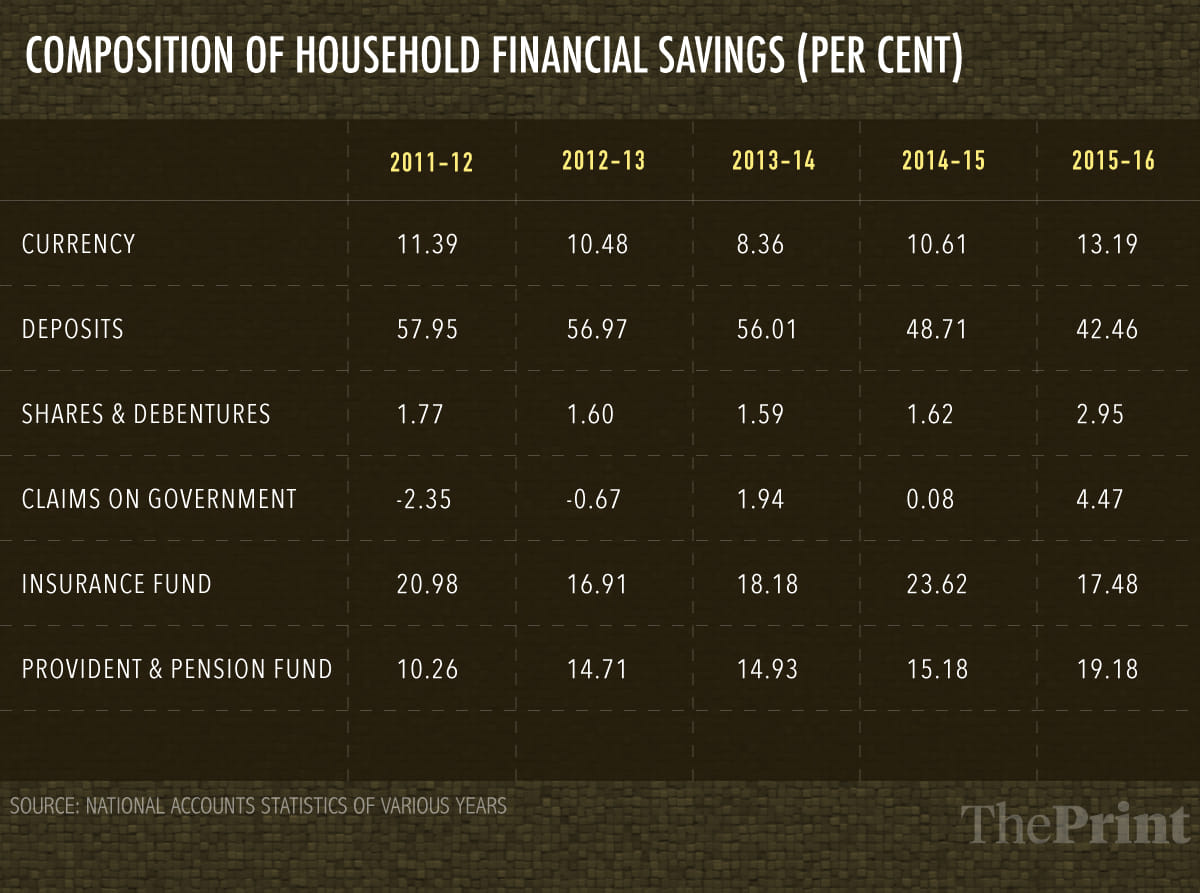 Table 1 shows the profile of financial savings over a shorter-term horizon. Bank deposits constitute the bulk of household financial savings, although its share in the overall household financial savings has seen a dip from 2011-2012 onwards. Still 57% of the financial savings are in cash and deposits leave a very small portion of savings in long-term savings. Shares and debentures constitute a small part of the overall financial savings of households. Investments in provident and pension funds have seen a gradual rise, though they still constitute a small proportion of the overall saving.