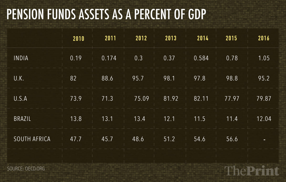 Insurance and pension penetration are low by international standards. Table 2 illustrates the assets of pension funds as a percent to GDP. Assets of pension funds are defined as assets bought with the contributions to a pension plan for the exclusive purpose of financing pension plan benefits. The pension fund is a pool of assets forming an independent legal entity. India lags behind not only advanced economies but is also placed after emerging economies in pension funds penetration.