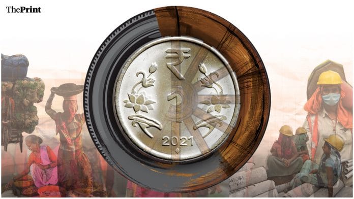 The second source of “formalisation” is the e-Shram portal, India’s first national database of unorganised workers. It facilitates extending benefits of social sector schemes to the workers in the unorganised sector. More than 5.3 crore workers had registered until 30 October. Based on monthly incomes of the registered workers, the report estimates that roughly half of the Rs 13 lakh crore formalisation is through the e-Shram portal. In this case, the worker is “registered”.