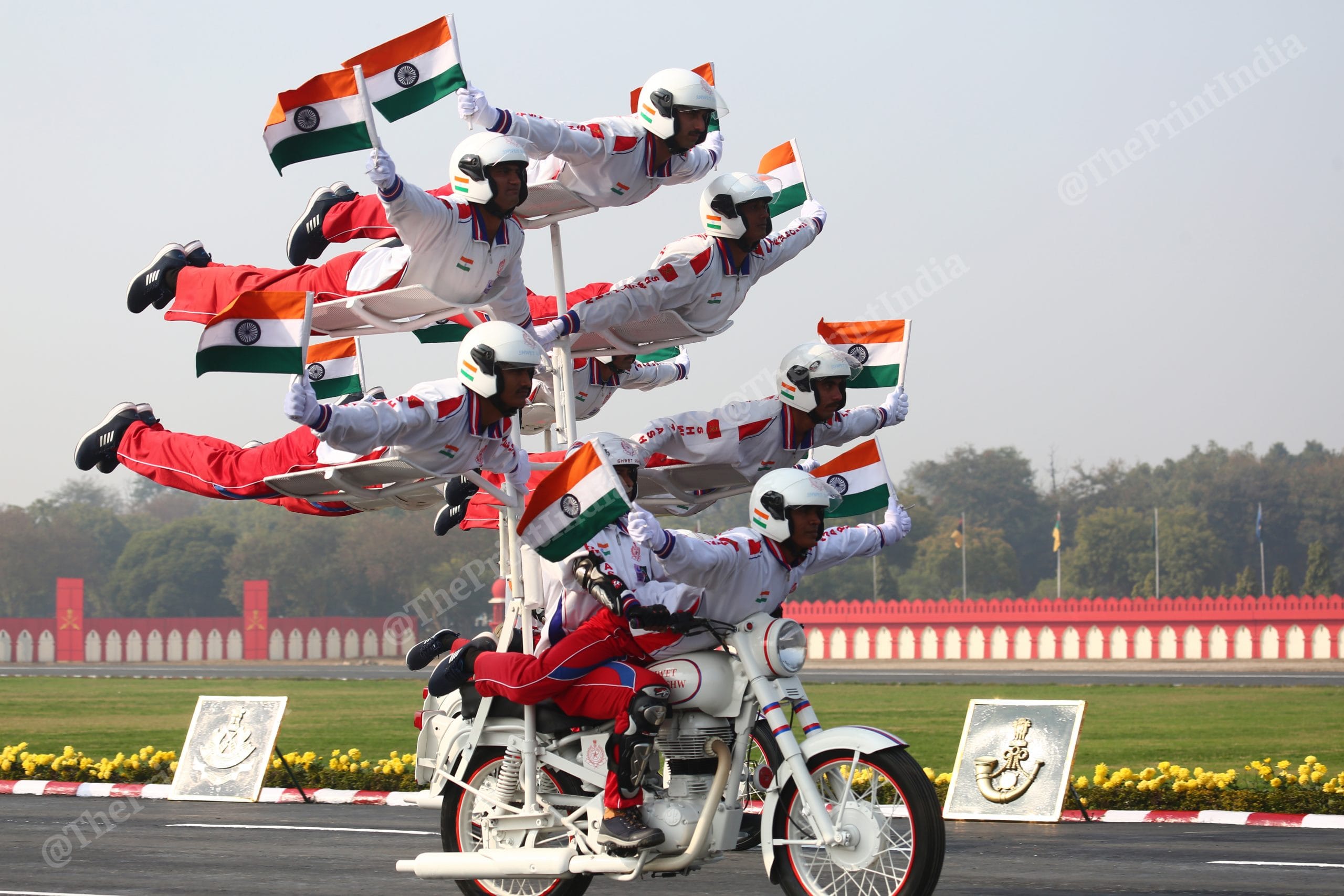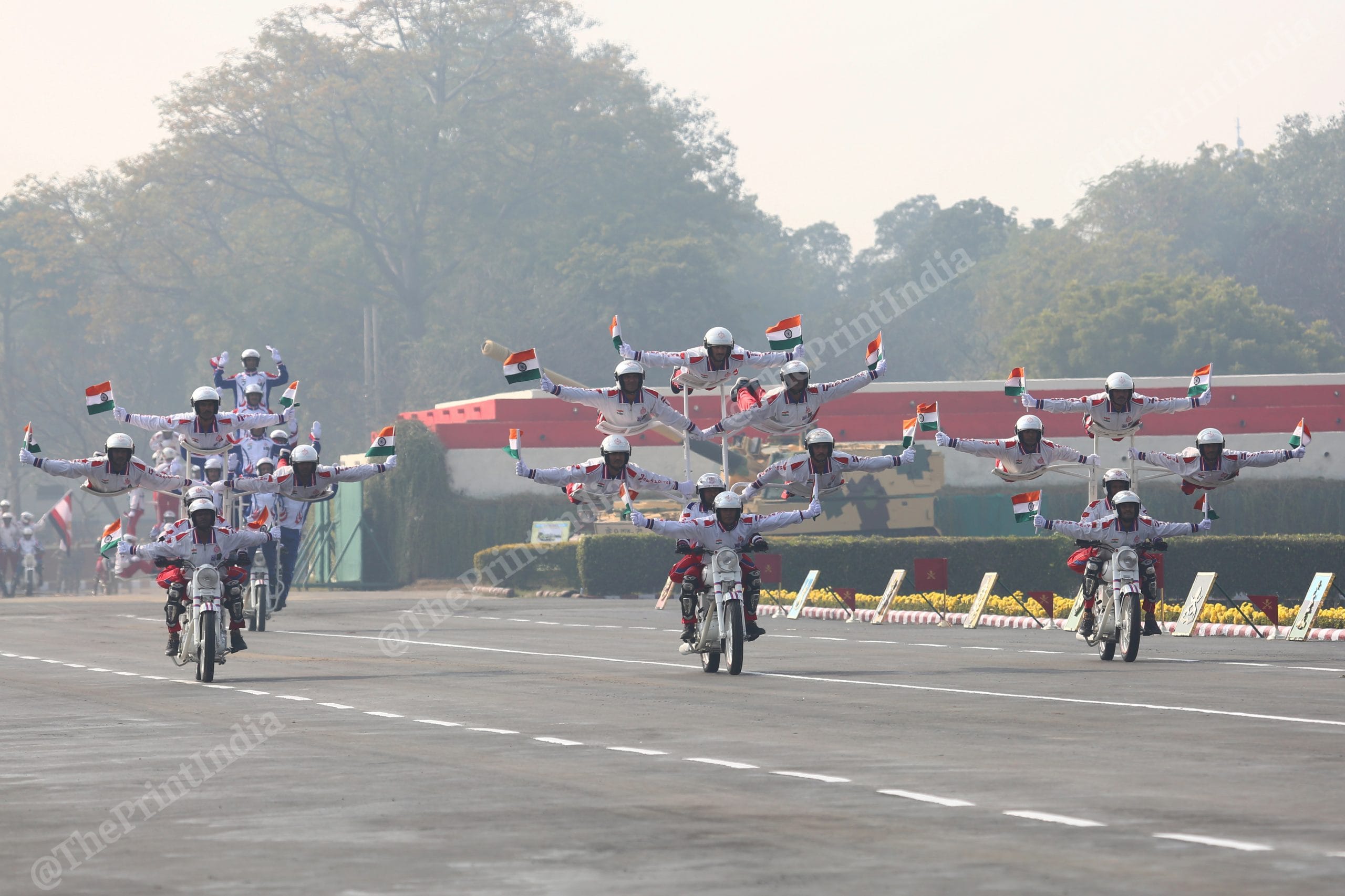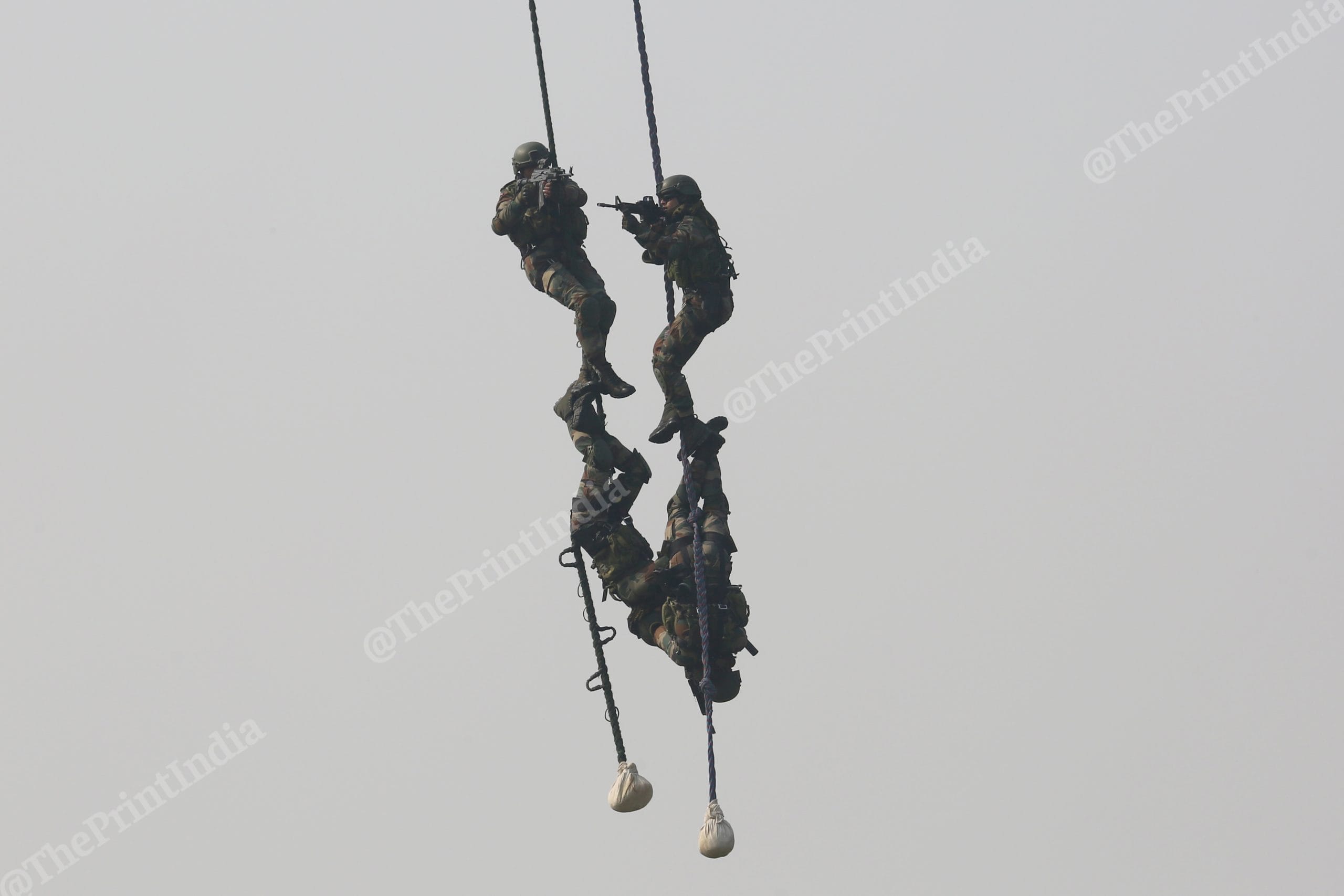 Army personnel put on a performance during the parade | Photo: Suraj Singh Bisht | ThePrintArmy personnel carry out a triple bike stunt during the Army Day parade in New Delhi | Suraj Singh Bisht | ThePrintAn Army stunt specialist balances on a moving motorbike during the Army Day parade | Suraj Singh Bisht | ThePrintArmy soldiers show their combat prowess while suspended on a wire from a chopper | Suraj Singh Bisht | ThePrintAn Army soldier climbs up a wire as a chopper holds position mid-air | Suraj Singh Bisht | ThePrintA contingent of the Military Police ride tandem while performing a bike stunt during the Army Day parade | Suraj Singh BishtSeven personnel of the Military Police balance on a motorbike as they perform a stunt on Army Day | Suraj Singh Bisht | ThePrint