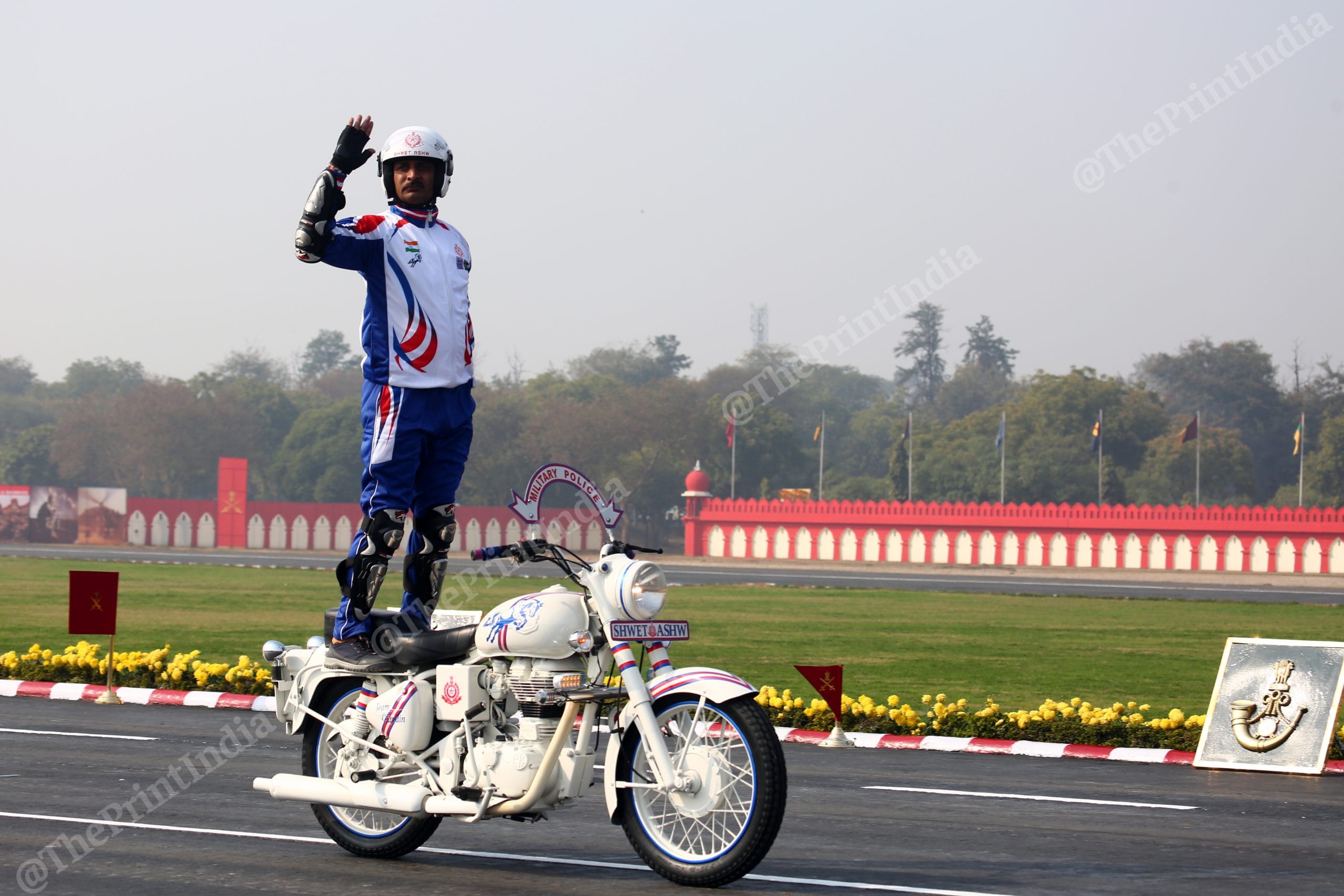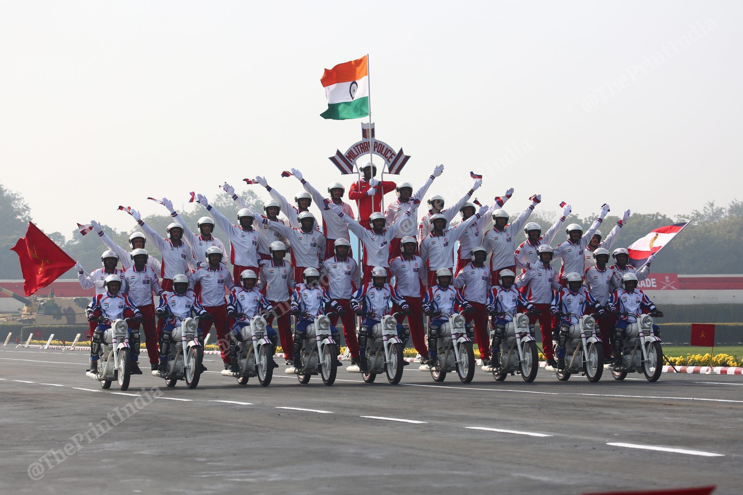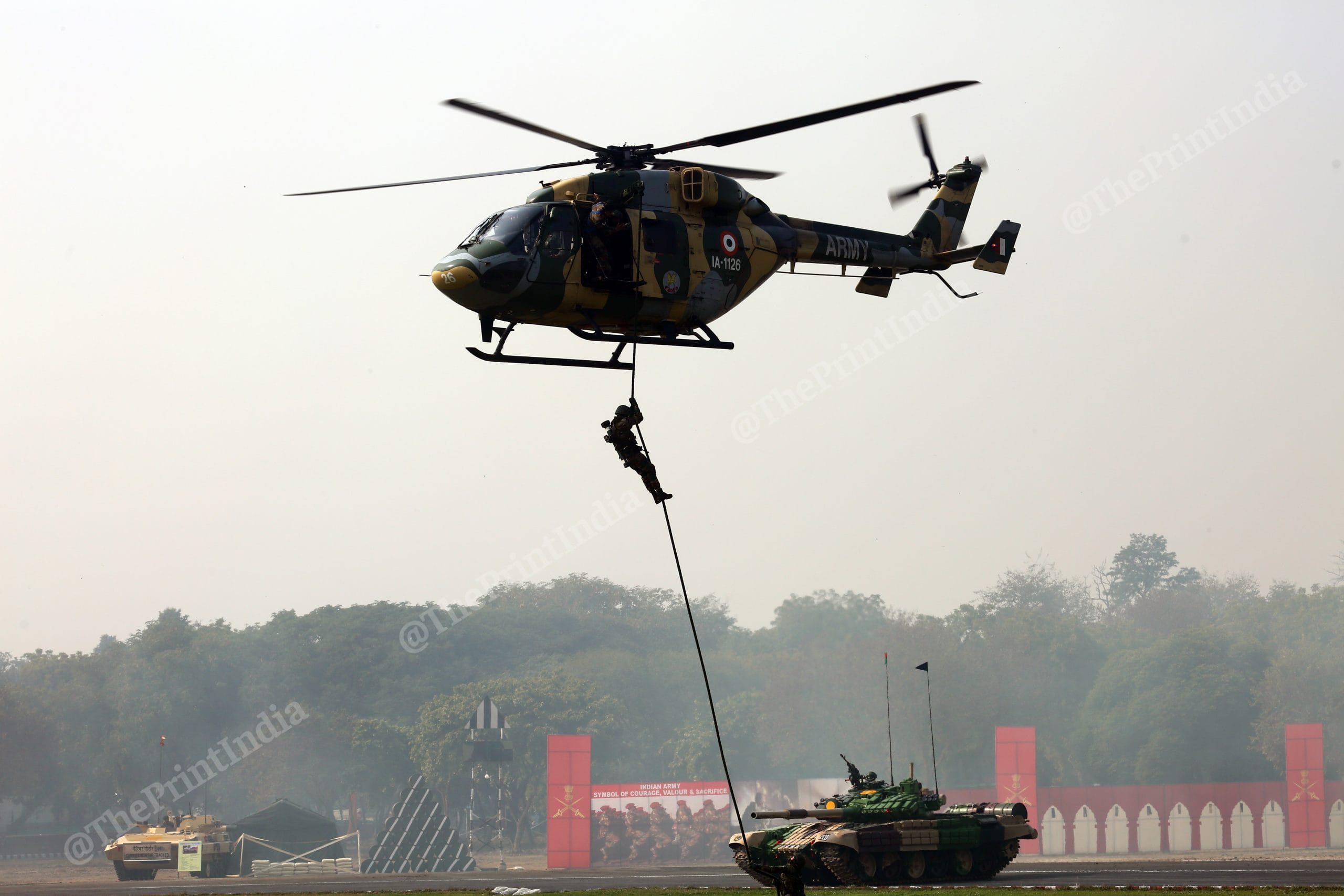 Army personnel put on a performance during the parade | Photo: Suraj Singh Bisht | ThePrintArmy personnel carry out a triple bike stunt during the Army Day parade in New Delhi | Suraj Singh Bisht | ThePrintAn Army stunt specialist balances on a moving motorbike during the Army Day parade | Suraj Singh Bisht | ThePrintArmy soldiers show their combat prowess while suspended on a wire from a chopper | Suraj Singh Bisht | ThePrintAn Army soldier climbs up a wire as a chopper holds position mid-air | Suraj Singh Bisht | ThePrintA contingent of the Military Police ride tandem while performing a bike stunt during the Army Day parade | Suraj Singh BishtSeven personnel of the Military Police balance on a motorbike as they perform a stunt on Army Day | Suraj Singh Bisht | ThePrint