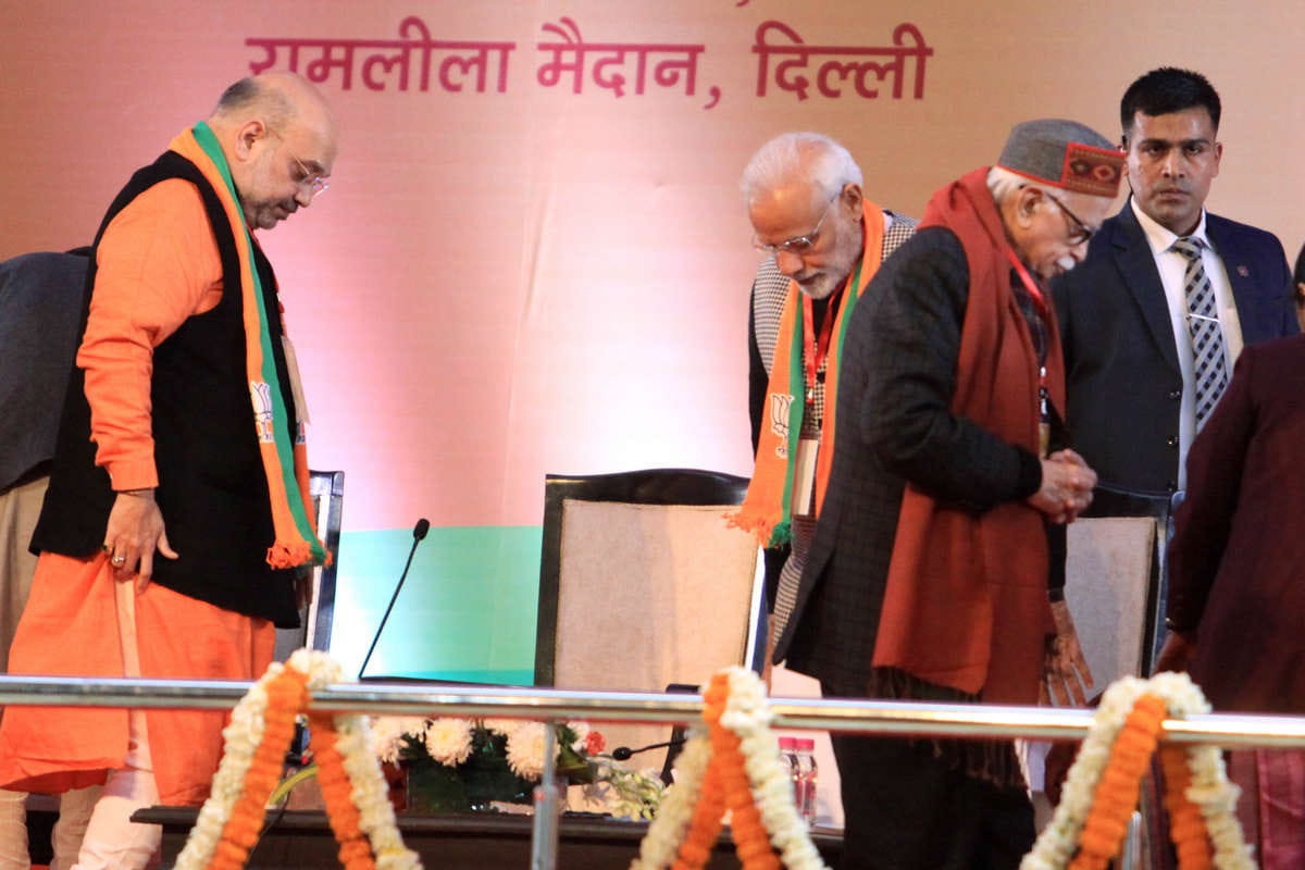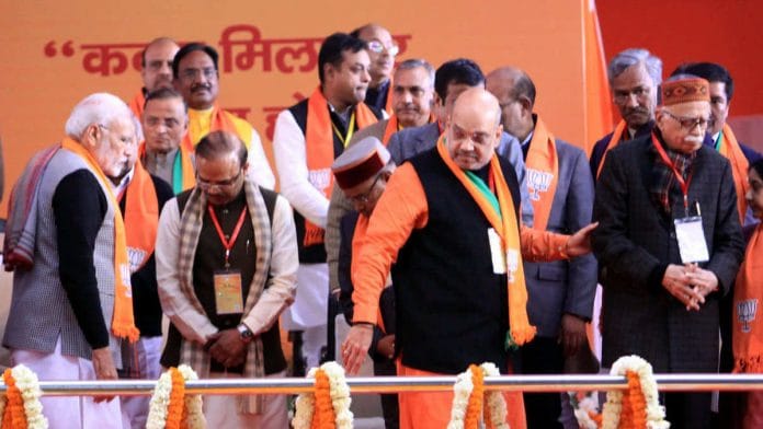Prime Minister Narendra Modi with BJP president Amit Shah and veteran leader L.K. Advani at the national convention in New Delhi on Friday | Praveen Jain/ThePrint
