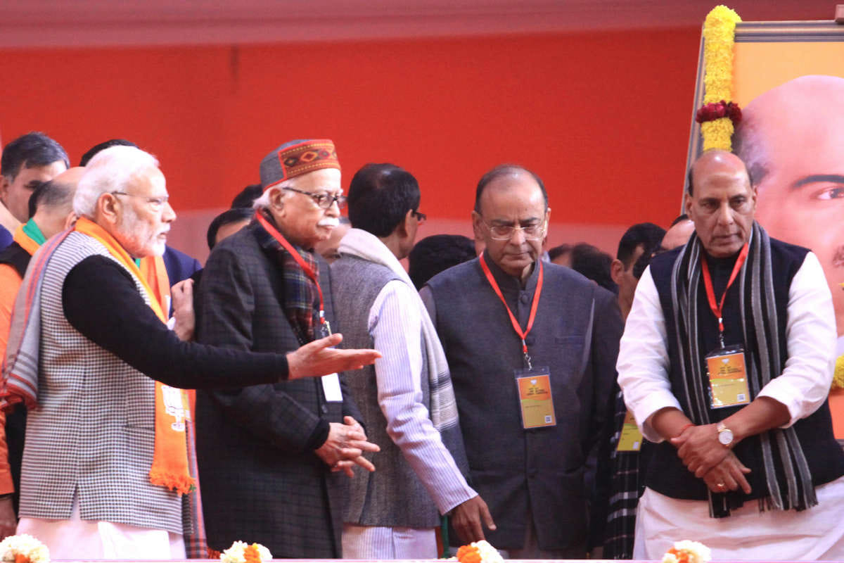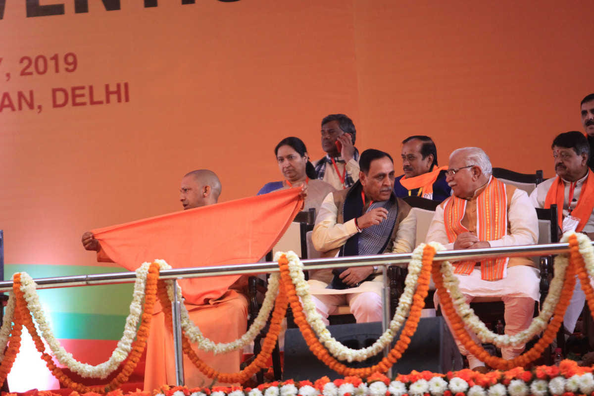Finance minister Arun Jaitley sits two seats away from LK Advani at the start of the BJP national convention in New Delhi on Friday | Praveen Jain/ThePrintBJP chief ministers Yogi Aadityanath (UP), Vijay Rupani (Gujarat), Manohar Lal Khattar (Haryana), and Trivendra Singh Rawat (Uttarakhand) with Union minister KJ Alphons and Arunachal Pradesh CM Pema Khandu at the party’s national convention in New Delhi on Friday | Praveen Jain/ThePrintUP chief minister Yogi Adityanath with Gujarat CM Vijay Rupani and Haryana CM Manohar Lal Khattar at the BJP national convention | Praveen Jain/ThePrint