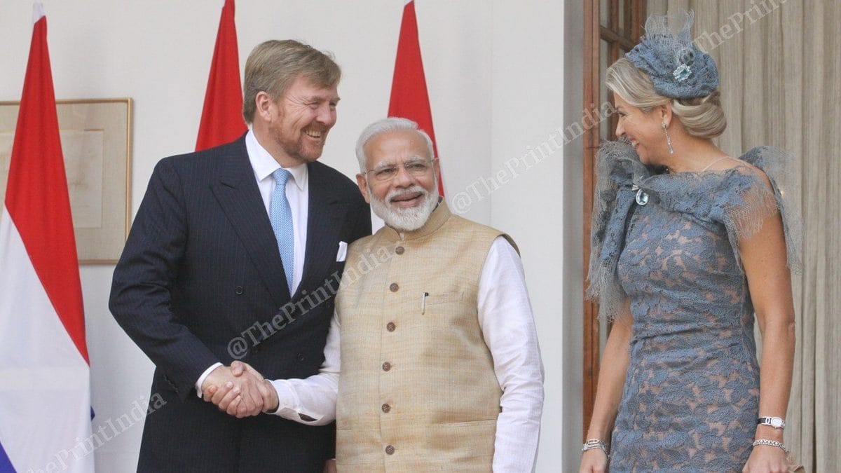 President Ram Nath Kovind and Prime Minister Narendra Modi at ceremonial reception for King Willem-Alexander at Rashtrapati Bhavan, Delhi | Photo: Praveen Jain | ThePrintPrime Minister Modi at the ceremonial reception at Rashtrapati Bhavan, Delhi. India and the Netherlands have a bilateral trade turnover of USD 12.87 billion (2018-19) | Photo: Praveen Jain | ThePrintPresident Kovind and Prime Minister Modi wait to receive King Willem-Alexander and Queen Maxima at Rashtrapati Bhavan. The Netherlands is the fifth largest investor in India | Photo: Praveen Jain | ThePrintQueen Maxima gives the traditional ‘namaste’ greeting during the ceremonial reception at Rashtrapati Bhavan | Photo: Praveen Jain | ThePrintQueen Maxima interacts with President Kovind’s wife Savita at Rashtrapati Bhavan | Photo: Praveen Jain | ThePrintPrime Minister Narendra Modi talks to Queen Maxima at the ceremonial reception | Photo: Praveen Jain | ThePrintChief of Army Staff Bipin Rawat with Cabinet Secretary Rajiv Gauba were also at the ceremonial reception | Photo: Praveen Jain | ThePrintDutch King Willem-Alexander with PM Modi at Hyderabad House. The royal couple will be attending the inaugural session of 25th Technology Summit in New Delhi on Tuesday. The Netherlands is the partner country for this Summit | Praveen Jain | ThePrint(Left to right) National Security Adviser Ajit Doval, Foreign Minister S. Jaishankar, Foreign Secretary Vijay Gokhale and Indian ambassador to Netherlands Venu Rajamony at Hyderabad House in New Delhi. The MEA said the royal visit is expected to boost economic and political cooperation between India and the Netherlands | Photo: Praveen Jain | ThePrint