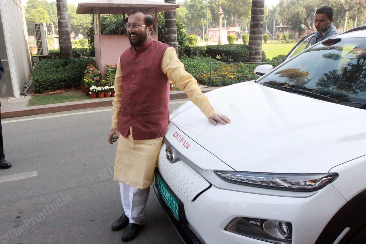 Cabinet Minister Prakash Javadekar, who holds the environment portfolio, made a statement about clean energy by driving his electric vehicle to Parliament.