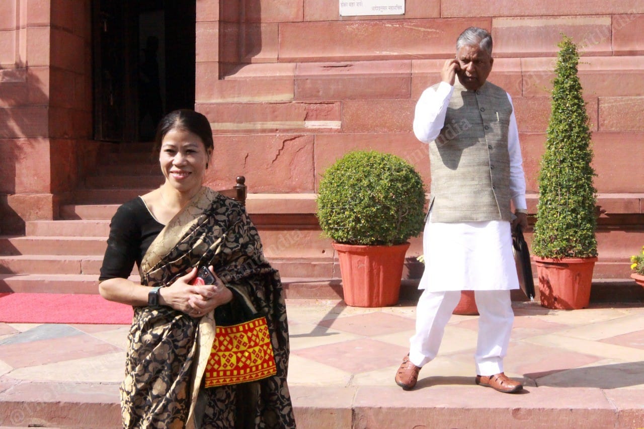 BJP MP Kirron Kher and V.K Singh shared a laugh outside Parliament. Kher, a Chandigarh MP, recently expressed concern over poor air quality in that city at a human rights conference held at Panjab University.