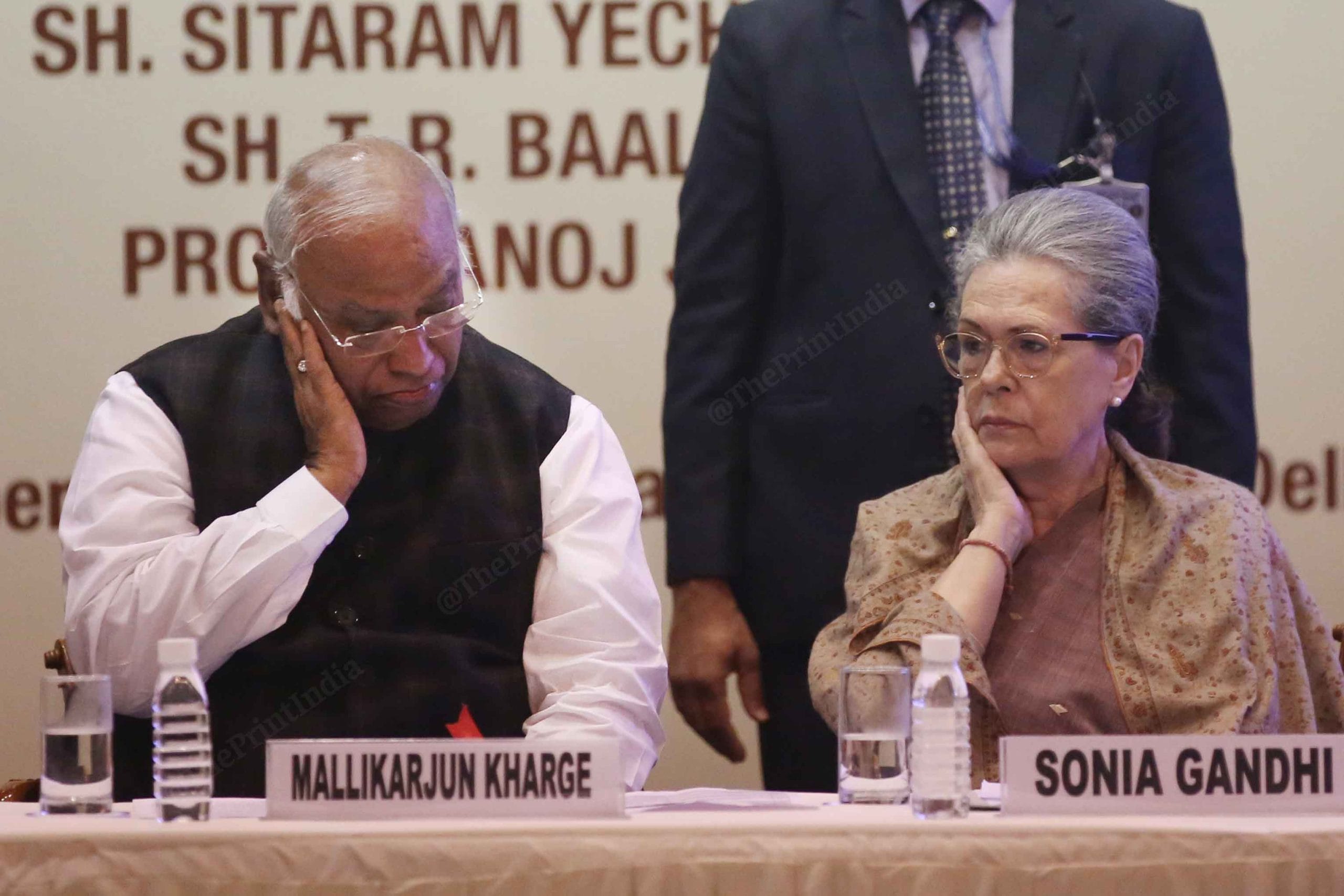 This image of Congress president Mallikarjun Kharge and the party’s Parliamentary Party chairperson Sonia Gandhi was taken days before the announcement of assembly election results in the states of Rajasthan, Madhya Pradesh, Chhattisgarh, Telangana and Mizoram this month. The image becomes significant in retrospect as the somber expression on the faces of the two leaders is in stark contrast to the confidence the party had voiced about winning most of these states. It ultimately won in only Telangana | Photo: Manisha Mondal | ThePrint