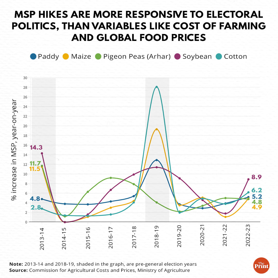 The data on annual hikes in MSP over a decade shows paddy support prices rose the sharpest, by 13 per cent, in 2018. That was the last Kharif before farmers, who form a sizable chunk of India’s population, voted in the general elections held in 2019.
