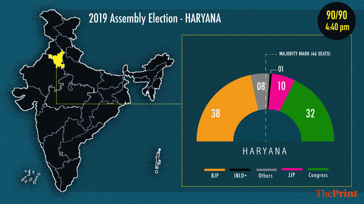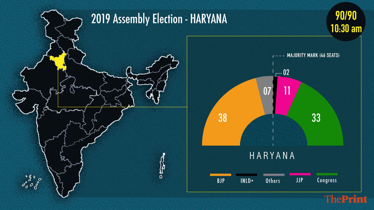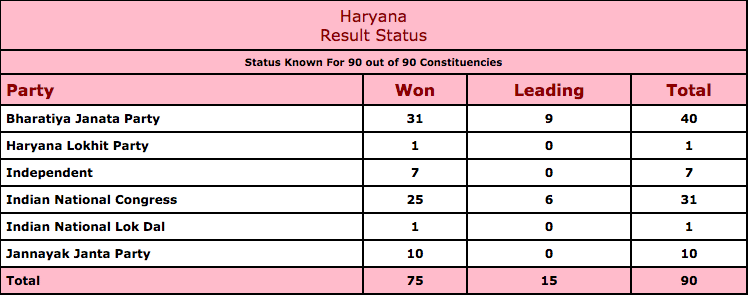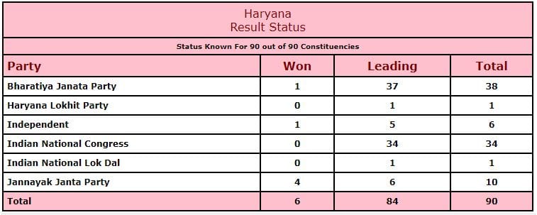 According to the Election Commission website at 10:30 pm, BJP had won 39 seats and was leading in one constituency in Haryana while Congress emerged victorious in 31 seats. Regional party Jannayak Janta Party bagged 10 seats.