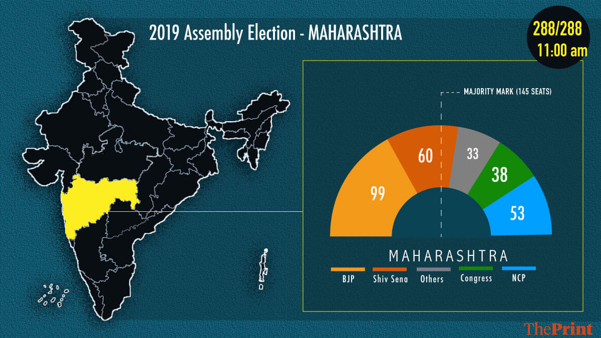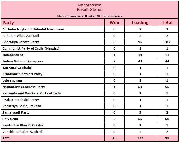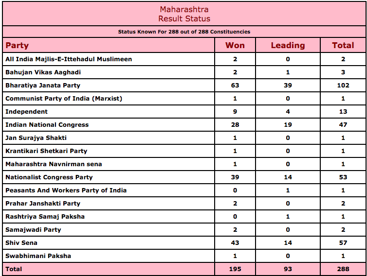In Maharashtra, BJP won 100 and was leading in 5 seats, Congress had secured 40 and was ahead in 4 constituencies. BJP ally-Shiv Sena won a total of 56 seats and NCP won 51 seats and was leading in 3 seats.