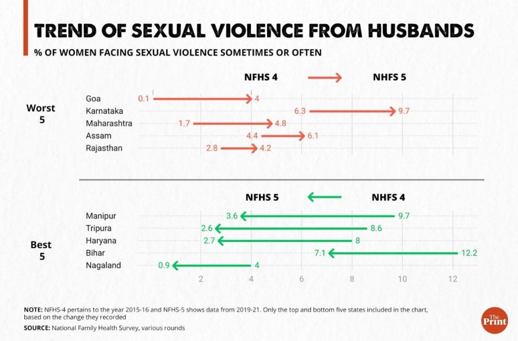 Apart from Karnataka, Goa and Maharashtra also show a considerable increase in the percentage of women reporting sexual violence in marriage.