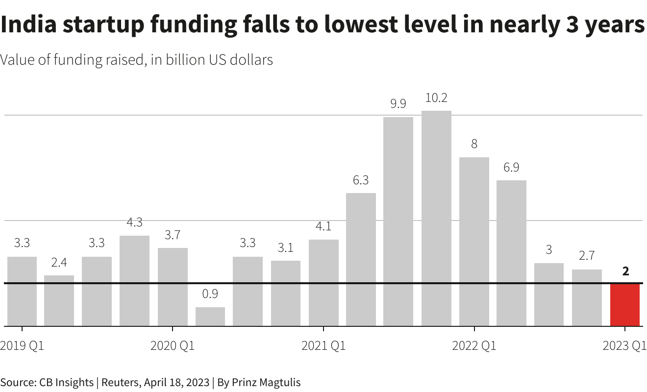 And only 271 Indian startups raised funding in Q1 2023, compared with 561 last year, according to CB Insights.