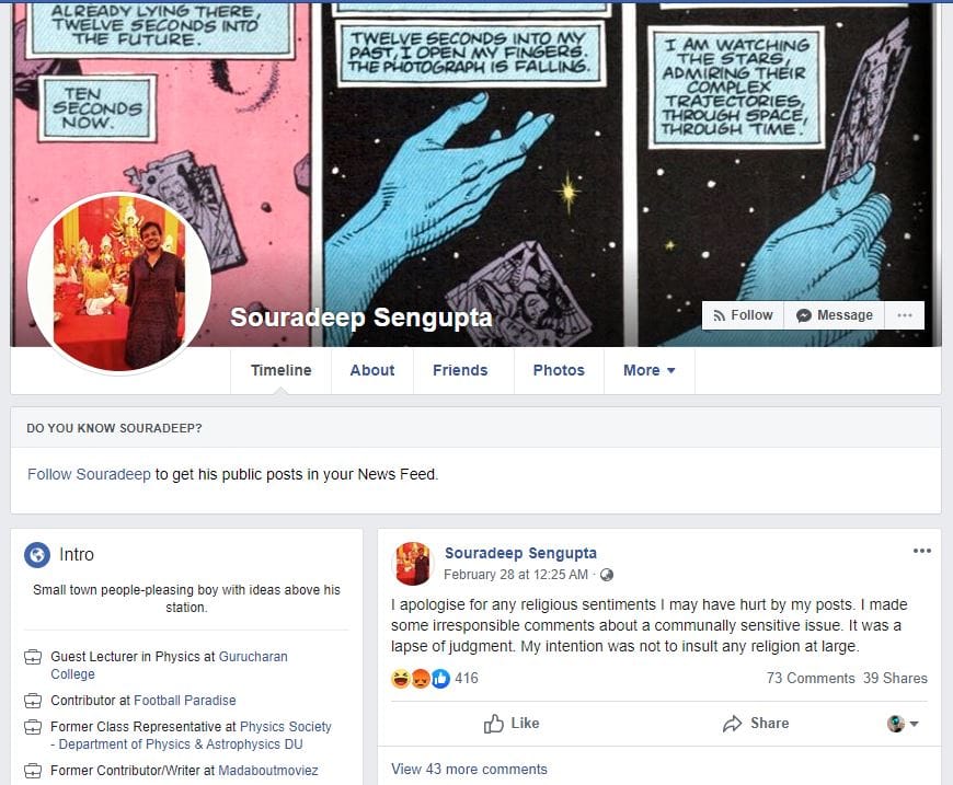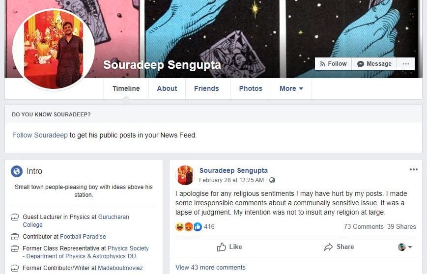 A little while later, Sengupta reactivated his account and posted an apology, saying his earlier comments were “irresponsible” and a “lapse of judgment”.