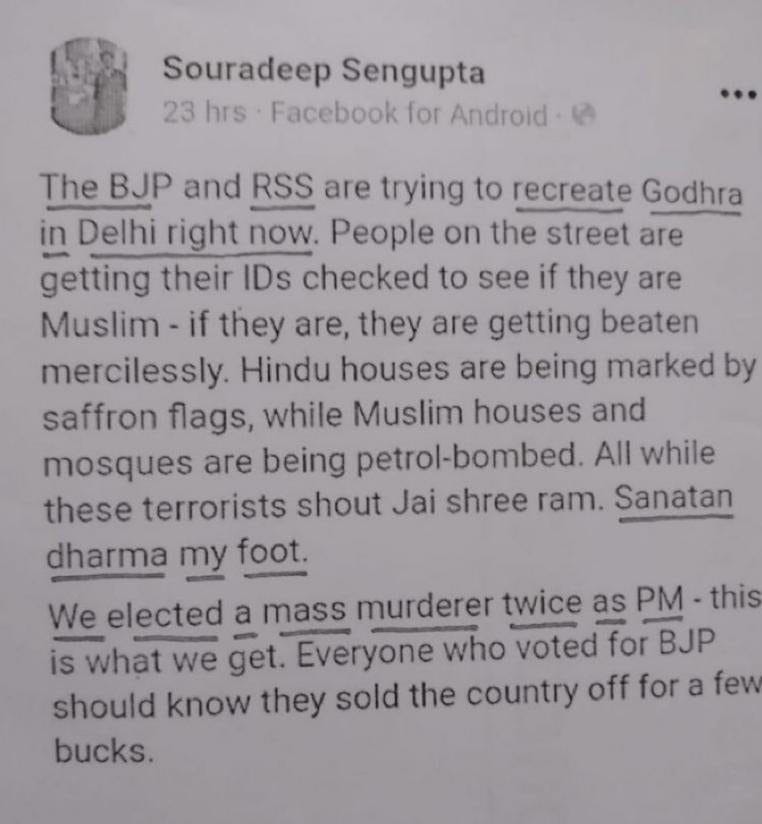 In several Facebook posts Thursday night, Sengupta accused the BJP and the RSS of “trying to recreate Godhra in Delhi” and called Prime Minister Narendra Modi a “mass murderer”. Images of the posts were circulated by an ABVP secretary Karanjit Deb, accusing Sengupta of “hurting their religion”. Soon after, Sengupta began receiving hate messages on social media, his cousin said, following which he deleted the posts and briefly deactivated his account.
