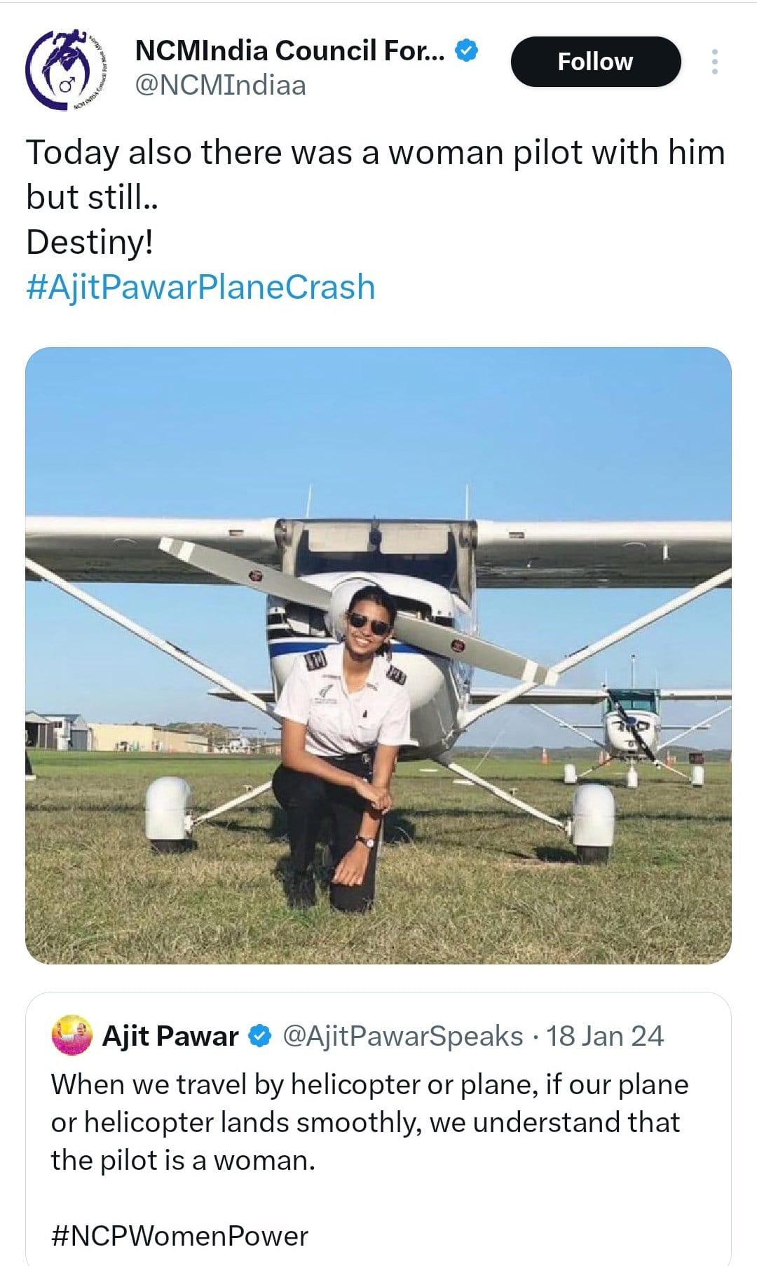 New Delhi: Even as an investigation has begun into the plane crash that killed Maharashtra deputy chief minister Ajit Pawar and four others in Baramati on Wednesday, men on social media have already identified the person responsible: the woman co-pilot.