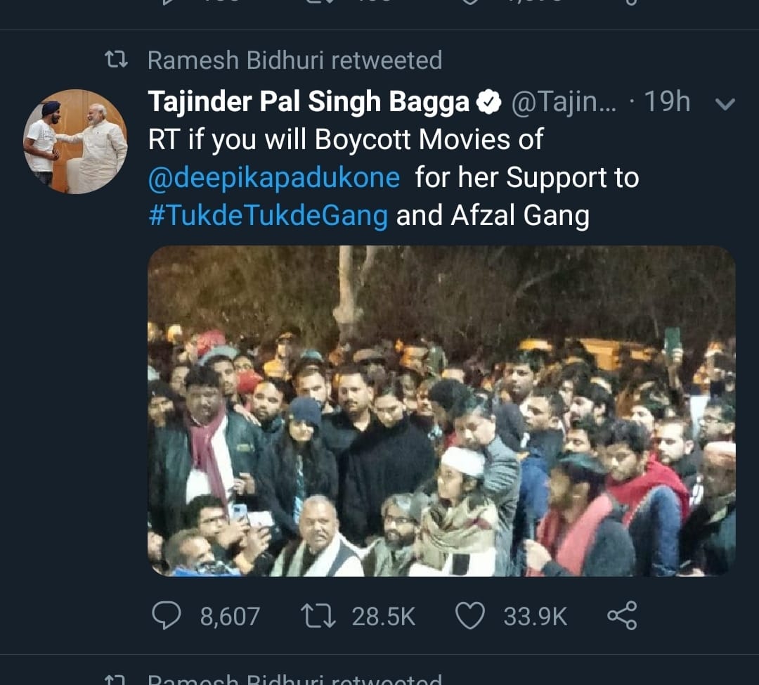 Following the actor’s visit, Delhi BJP spokesperson Tajinder Pal Singh Bagga asked people on Twitter to boycott her movies for supporting the “tukde tukde gang”.