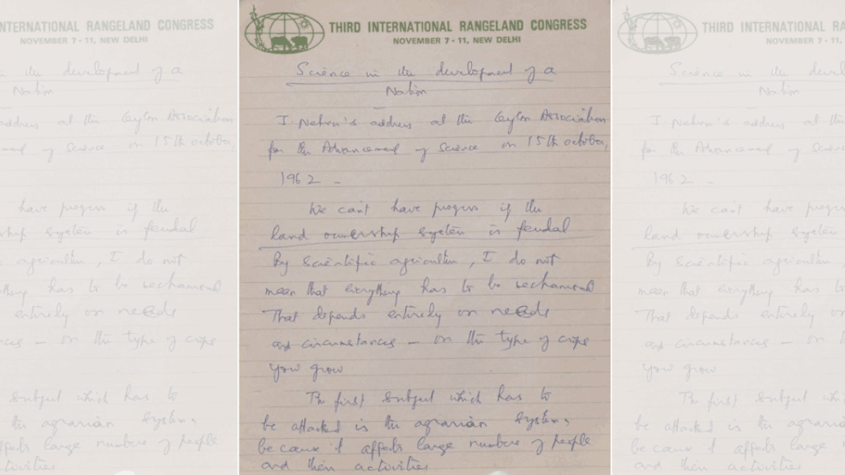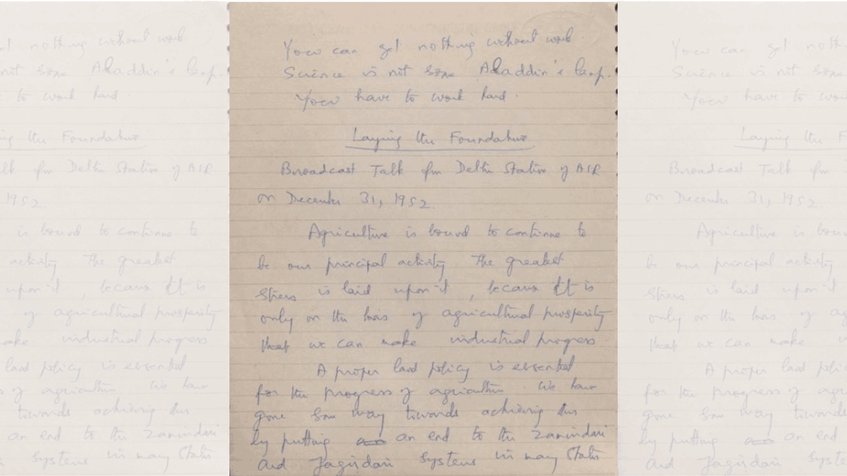 The notes from a 1962 speech by Nehru say, “We can’t have progress if the land ownership is feudal,” adding, “Science is not some Aladdin’s lamp. You have to work hard”. These appear to be from the book Jawaharlal Nehru on Science.