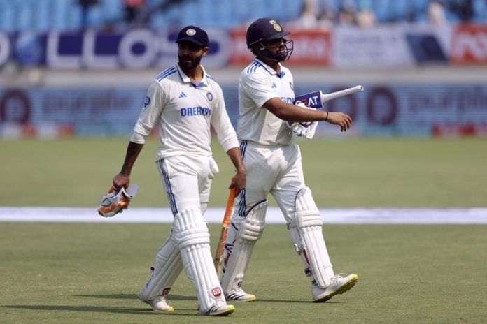 RAJKOT, India (Reuters) -India captain Rohit Sharma combined with Ravindra Jadeja in a 152-run stand for the unbroken fourth wicket on Thursday to help the hosts weather a top-order wobble and reach 185 for three at tea on the opening day of the third test.