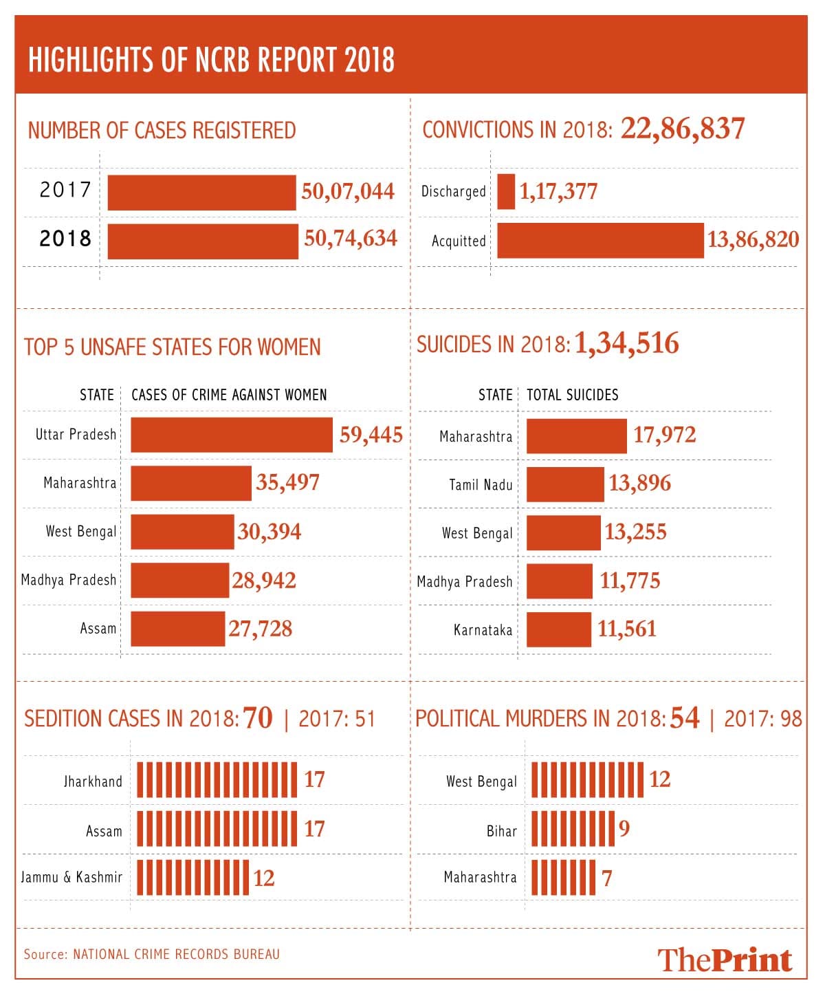 This, the report states, is a 1.3 per cent rise in registration of cases from 2017 when 50,07,044 cases were recorded. The crime rate per lakh population has, however, come down from 388.6 in 2017 to 383.5 in 2018.