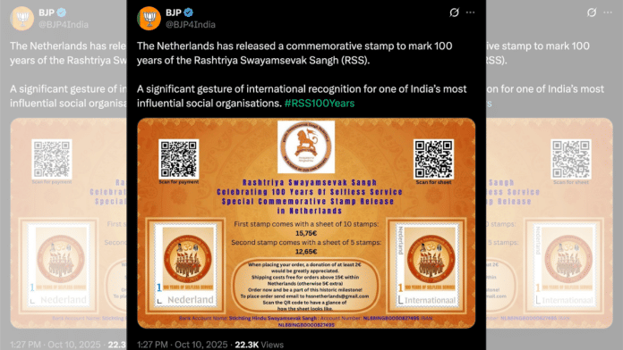 New Delhi: Netherlands’ sole postal service and the Dutch embassy in New Delhi have denied issuing the commemorative “stamp” that BJP publicly claimed was released by the European country to mark 100 years of the Rashtriya Swayamsevak Sangh (RSS).