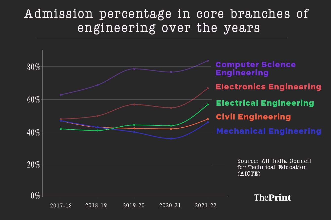 According to the All India Council for Technical Education (AICTE) data from 2017 to 2021, accessed by ThePrint, despite the admission percentage picking up across branches in engineering, it hasn’t even reached 50 per cent in the Mechanical and Civil engineering branches. In contrast, Computer Science and Electronics have had admissions above 60 per cent in all five years.