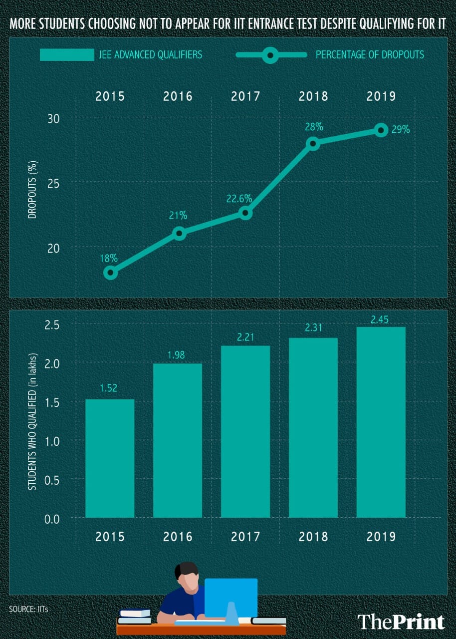 In 2015, 18 per cent of 1.52 lakh IIT aspirants — around 28,000 — didn’t attempt JEE Advanced even though they cleared JEE Mains, the first stage. In 2019, the number was 29 per cent of 2.45 lakh, or approximately 72,000.