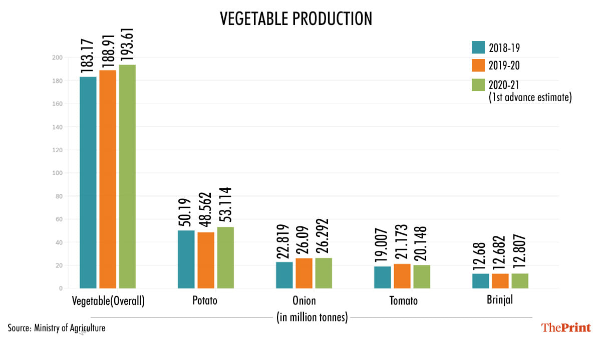 Dr A.K. Singh, deputy director general (horticulture), Indian Council of Agricultural Research, told ThePrint, “The sustained technological support and policy incentive has been driving the increase in vegetable and fruits production across the country.”
