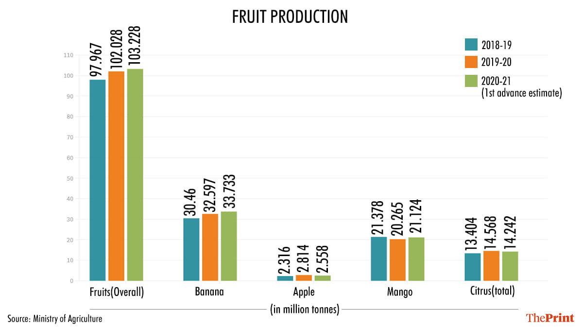 The overall fruit production is also estimated to increase — to 103.23 million tonnes in 2020-21 as compared to 102.03 million tonnes in 2019-20.