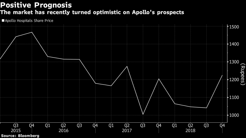Now, almost 20 billion rupees ($280 million) and four years of construction later, there are signs that strategy is about to pay off. All those hospitals are built. Analysts are predicting that annual earnings are poised to climb for the first time since 2015. Apollo’s shares have gained about 30 percent after hitting a four-year low in June, and stock forecasters are more bullish than they have been in a decade.