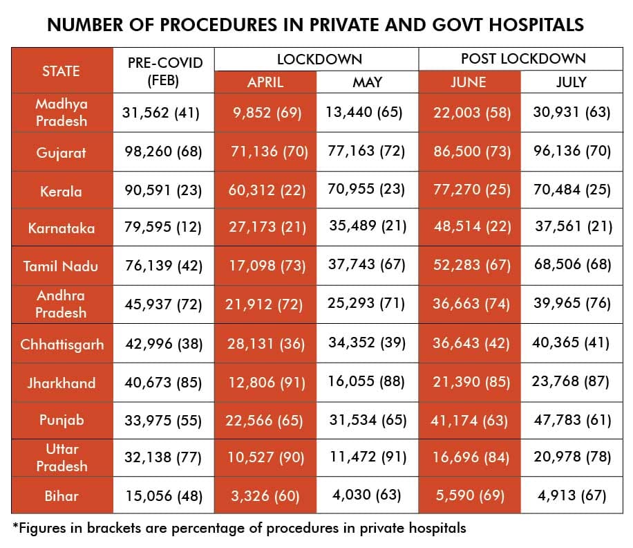In Tamil Nadu, PM-JAY claims from the private sector rose to 68 per cent in July as compared to 42 per cent pre-lockdown (in February). In Madhya Pradesh, the share has gone up to 63 per cent from 41 per cent and, in Bihar, to 67 per cent from 48 per cent. While the extent of the surge varies from 26 percentage points in Tamil Nadu to 2 percentage points in Gujarat, there has been an upward trend across the country.