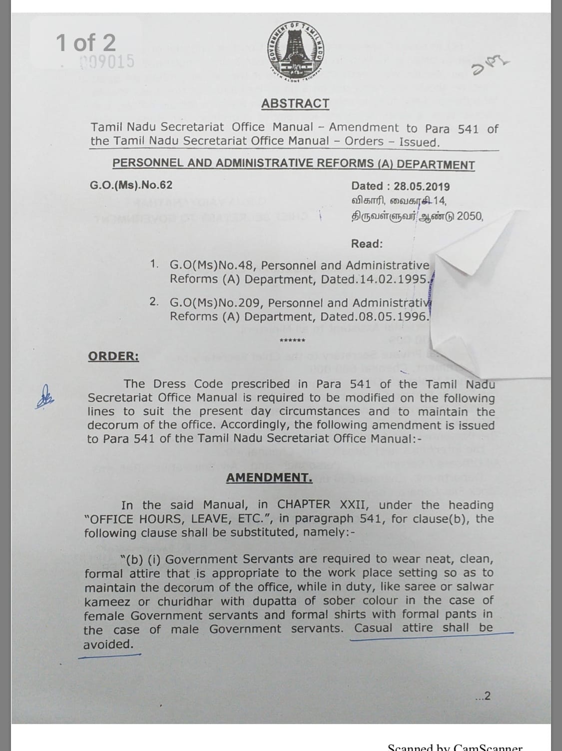 Two GOs were issued in just the past week. The first was on 28 May, which was an amendment of the earlier Tamil Nadu Secretariat office manual — it said that women needed to wear neat, clean, formal attire like saree or salwar kameez or a churidar with dupatta of “sober colour”, while men should follow the dress code of shirts with formal pants.