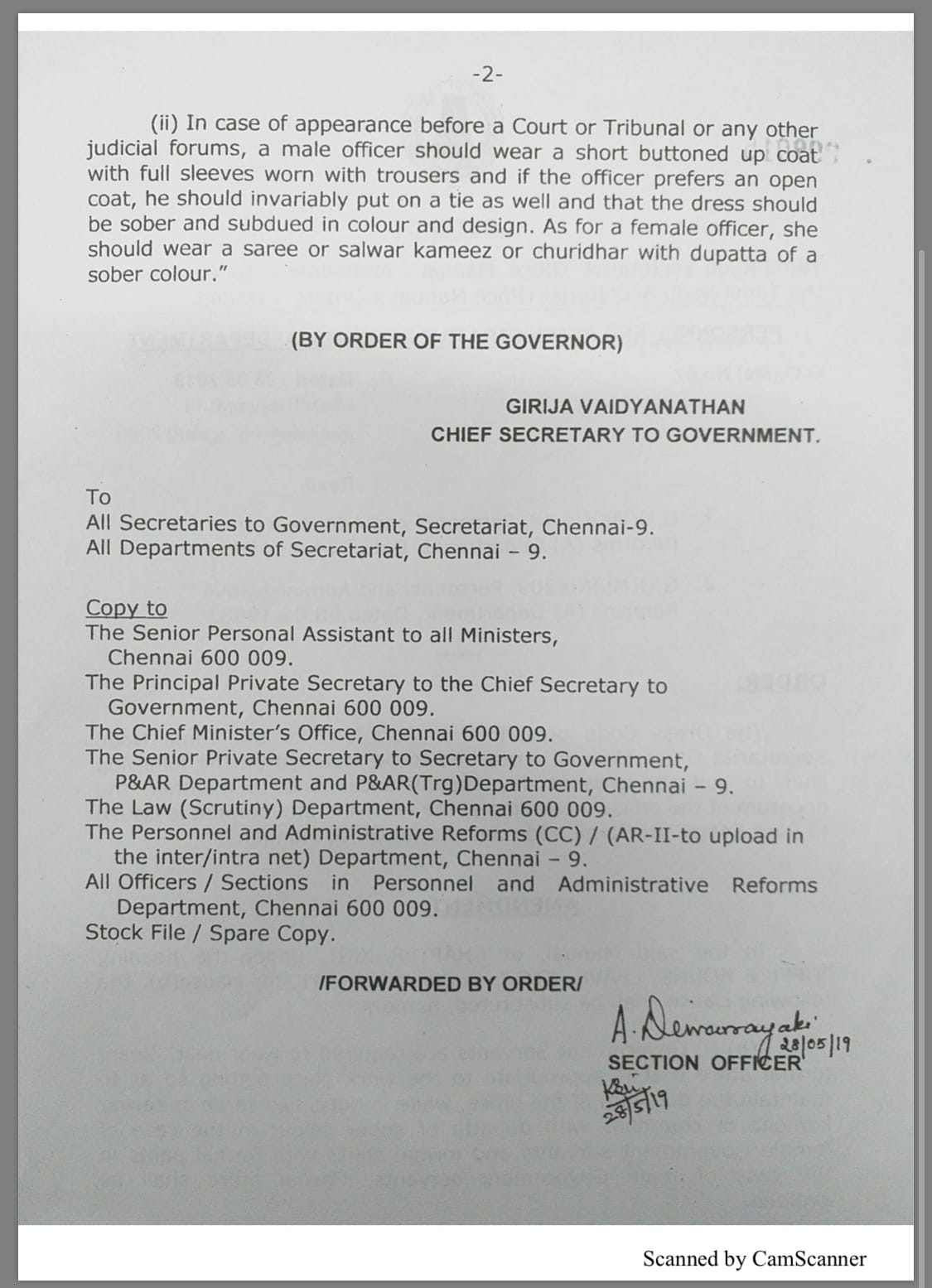 Bengaluru: The Tamil Nadu government has issued a Government Order (GO) for the dress code to be followed in its offices. The order, issued by Tamil Nadu chief secretary Girija Vaidyanathan, states that casual attire should be avoided and employees should wear clothes that reflect Indian and Tamil culture, and maintain decorum.