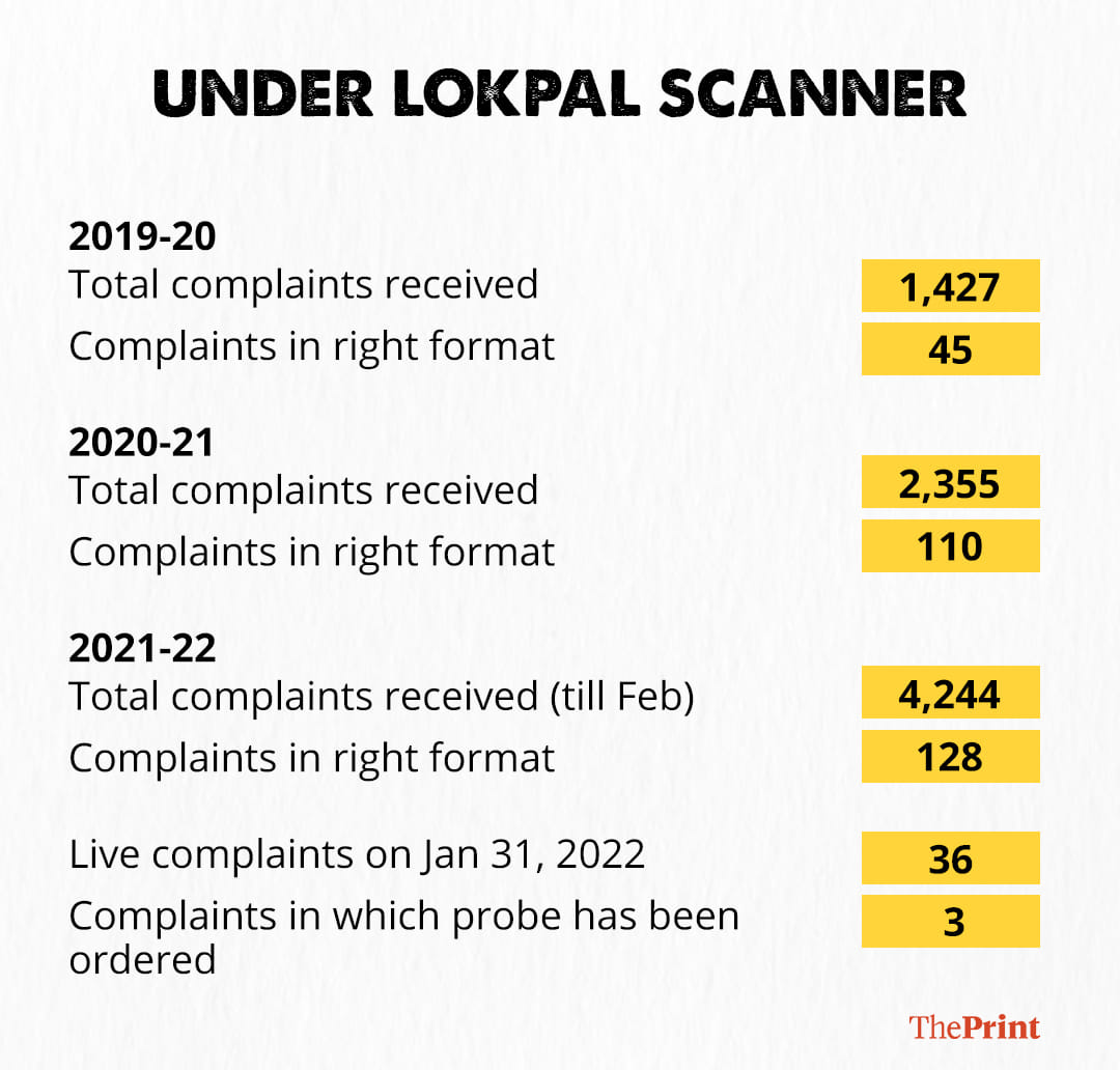 In 2021-22, of the 4,244 complaints received (till February 2022) by the Lokpal, only 128 were in the prescribed format. In 2020-21, of the 2,355 complaints received, 110 were in the prescribed format, while in 2019-20, just 45 of the 1,427 complaints received were in the correct format.