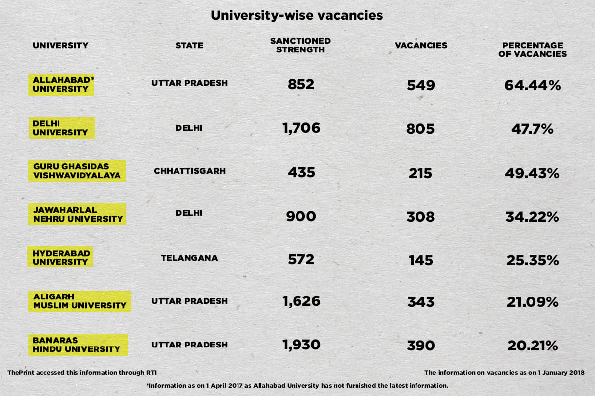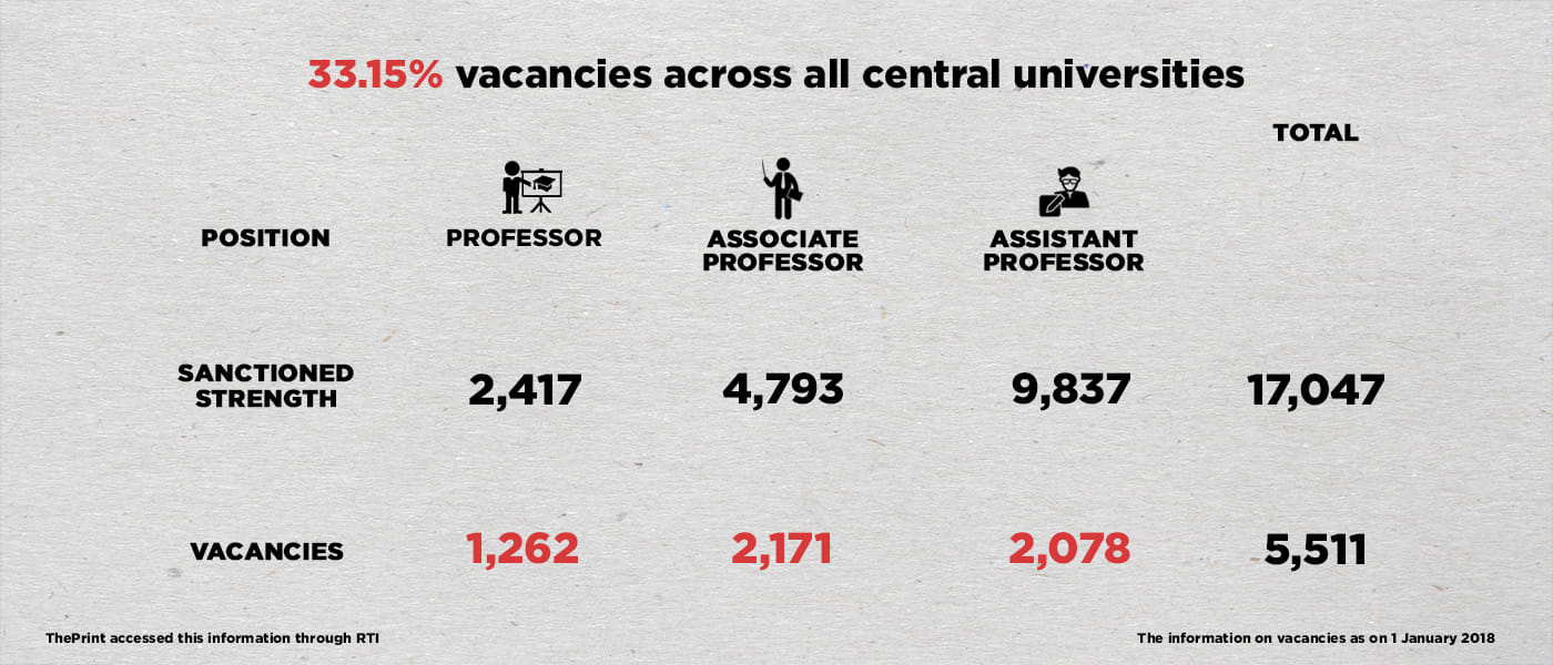 Government information accessed by ThePrint through an RTI application shows that until January this year, 33 per cent of teaching positions have not been filled up in the central universities.