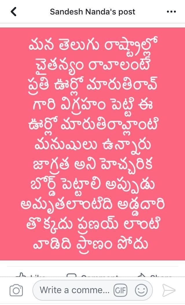 “To bring awareness/education in Telugu speaking states, a statue of Maruthi Rao should be installed in every village with a warning board stating that people like Maruthi Rao are here,” reads a post by Sandesh Nanda. “Then a girl like Amrutha will not go in the wrong path, and boys like Pranay will not get killed”.