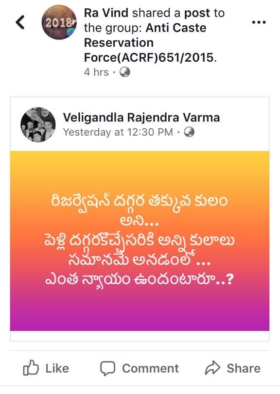 “(They are) lower castes when it comes to reservations, but when it comes to marriage, (they think) all castes are equal? To what extent is that fair?” reads a comment by Veliganda Rajendra Verma, posted on the page Monday.