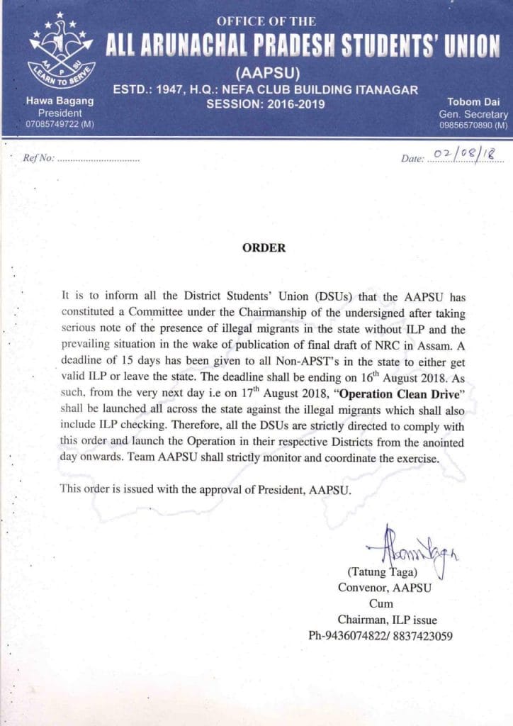 In a statement released Wednesday, the student body set a deadline of 16 August 2018 for such people to acquire an ILP. “From the very next day, i.e on 17th August 2018, ‘Operation Clean Drive’ shall be launched all across the state against the illegal migrants which shall also include ILP checking”, the statement reads.