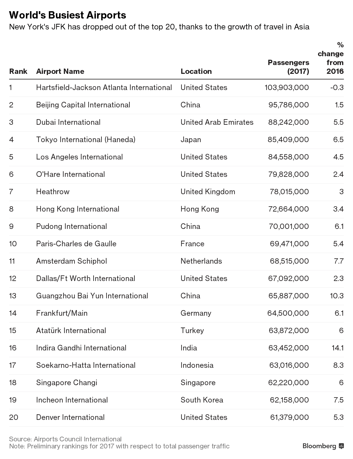 New York’s John F. Kennedy International Airport is no longer ranked among the 20 busiest in the world, thanks to the rush in Asia.