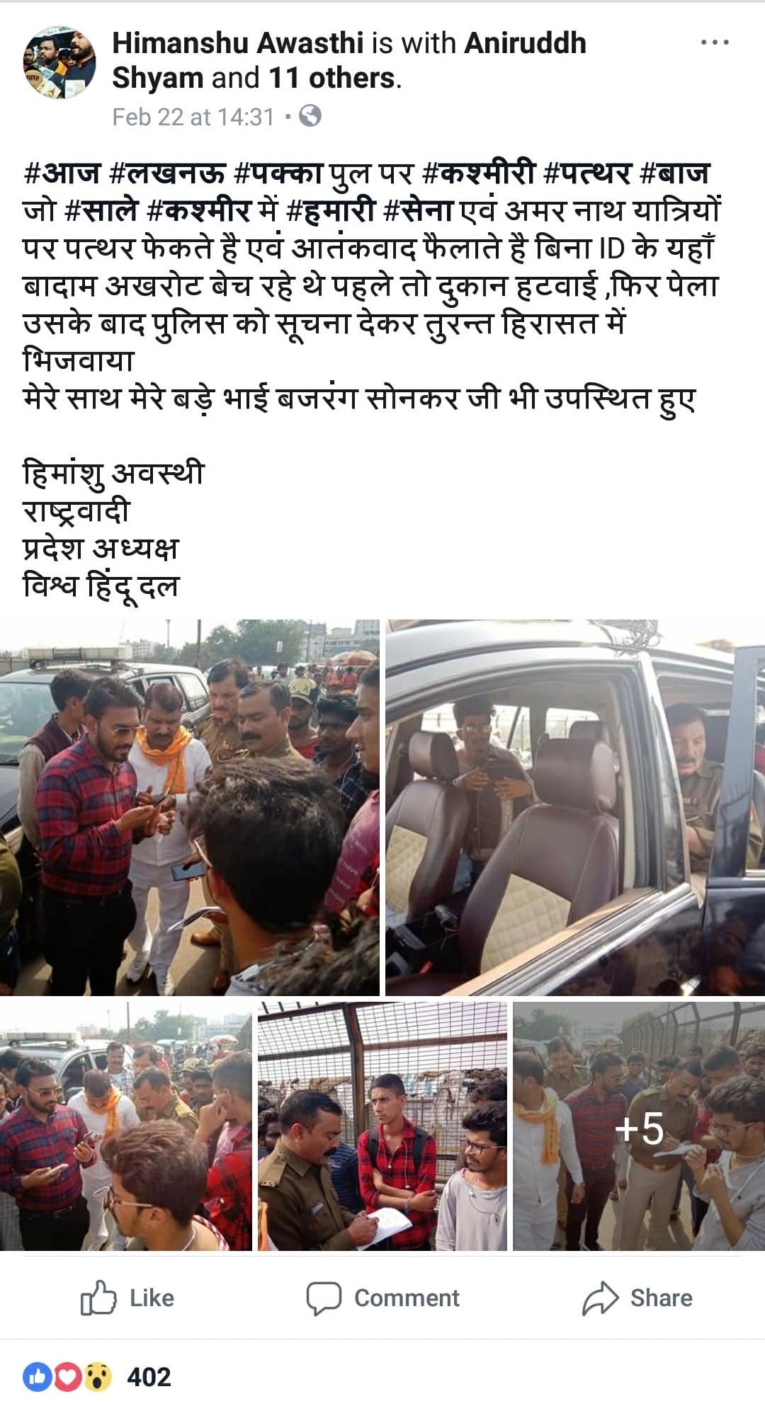 A post from 22 February on Awasthi’s Facebook profile said that he and Sonkar had “gotten Kashmiris arrested for selling groundnuts without identification”.