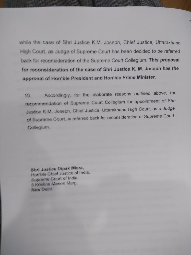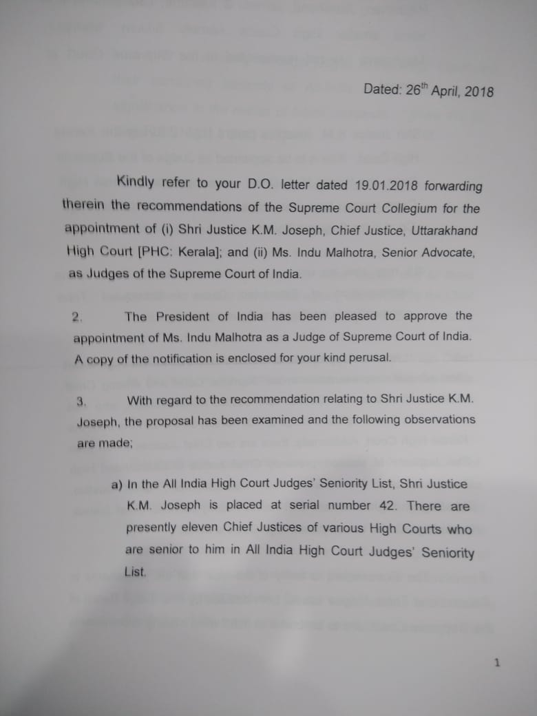 “In the all India high court judges’ seniority list, Shri Justice K.M. Joseph is placed at serial number 42. There are presently (sic) 11 chief justices of various high courts who are senior to him in (the list),” the government said in the letter.