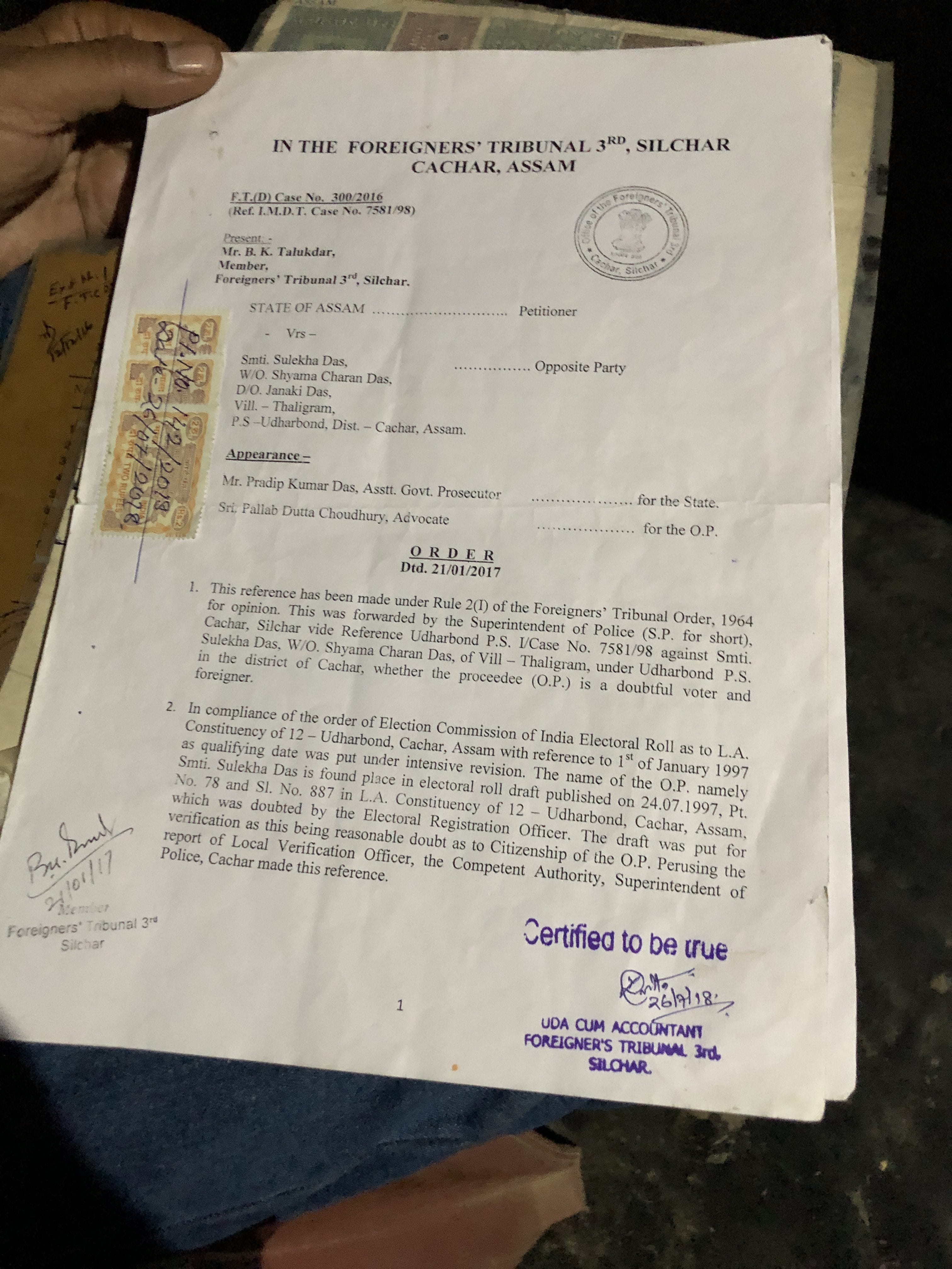 The grounds against her, according to the legal documents, are that she failed to establish “her place of birth at Ratabari, Karimganj, and could not substantiate her year of birth”.