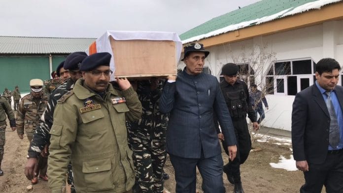 Srinagar: Home Minister Rajnath Singh Friday helped carry the coffin of a slain CRPF jawan after he laid a wreath on the mortal remains of the troops, who were killed in a terror attack in Jammu and Kashmir, officials said.